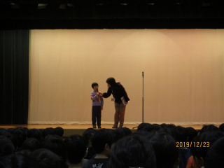 今日も1日がんばりましょう 2019年12月23日 14時43分 今日の出来事 全校朝会が終了したら、上の学年から体育館を後にします。 その際は、校長と副校長とあいさつを交わしたりハイタッチをしたりします。
